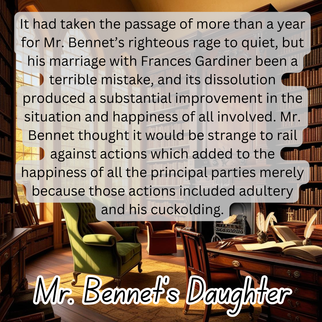 It had taken the passage of more than a year for Mr. Bennet’s righteous rage to quiet, but not only had his marriage with Frances Gardiner been a terrible mistake (that he had determined before the first year of marriage was complete, and long before Mr. Yates had even arrived in Meryton), its dissolution produced a substantial improvement in the situation and happiness of all involved, though not in their reputations.
